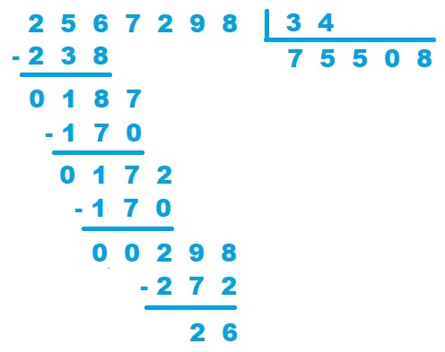 pero como al multiplicar 9 por 34 nos da 306, que es mayor que 298, quitamos una unidad a 9 y no queda 8, que es la quinta cifra del cociente. Multiplicamos x 34 = 272 y lo colocamos debajo del dividendo parcial para restarlo, 298 - 272 = 26 y com ya no quedan más cifras del dividendo hemos terminado la división, siendo 26 el resto de la misma, que siempre debe ser menor que el divisor.